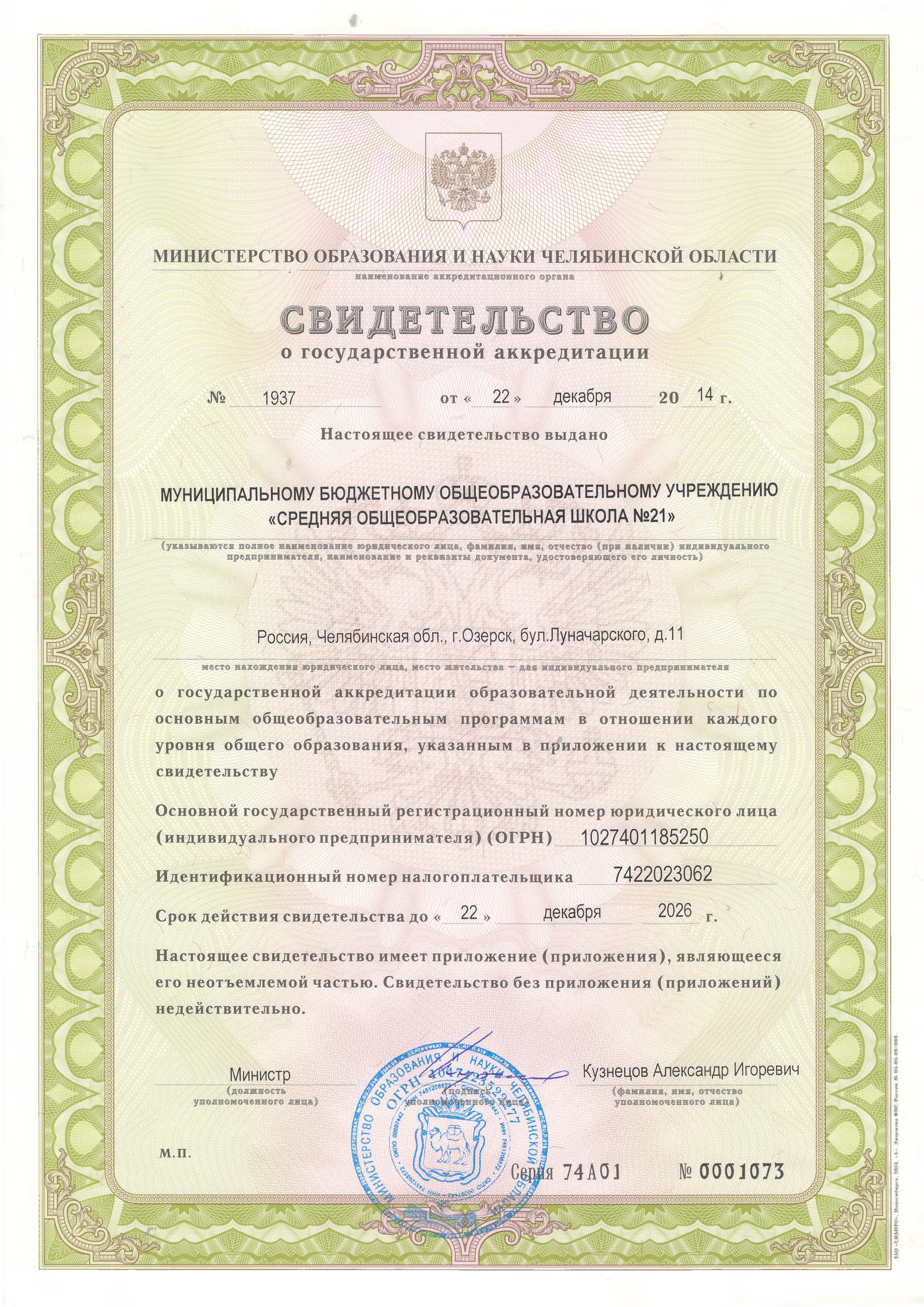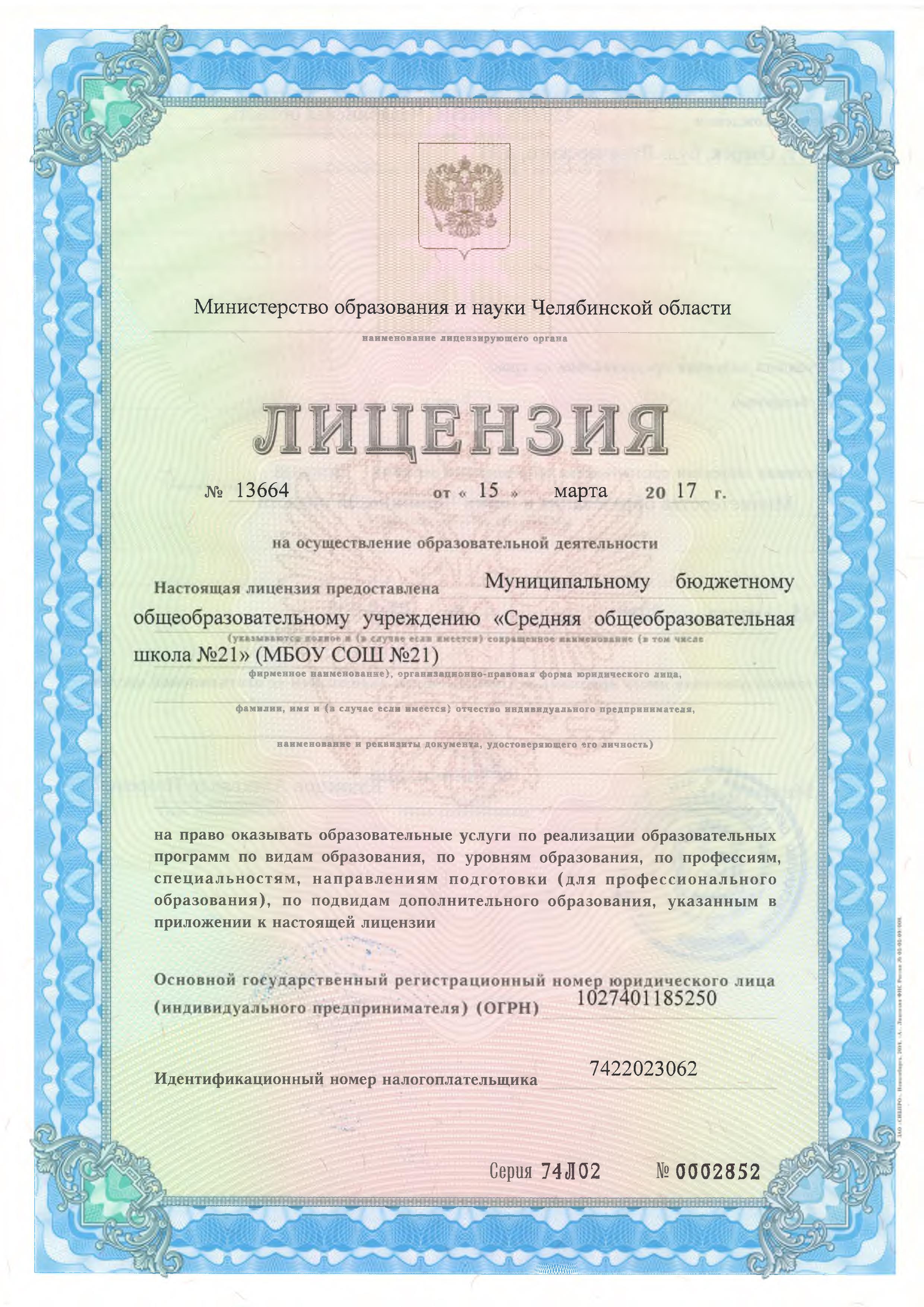 Выдано Министерством образования и науки Челябинской области 22.12.2014 г., регистрационный № 1937, срок действия — 22.12.2026 г.