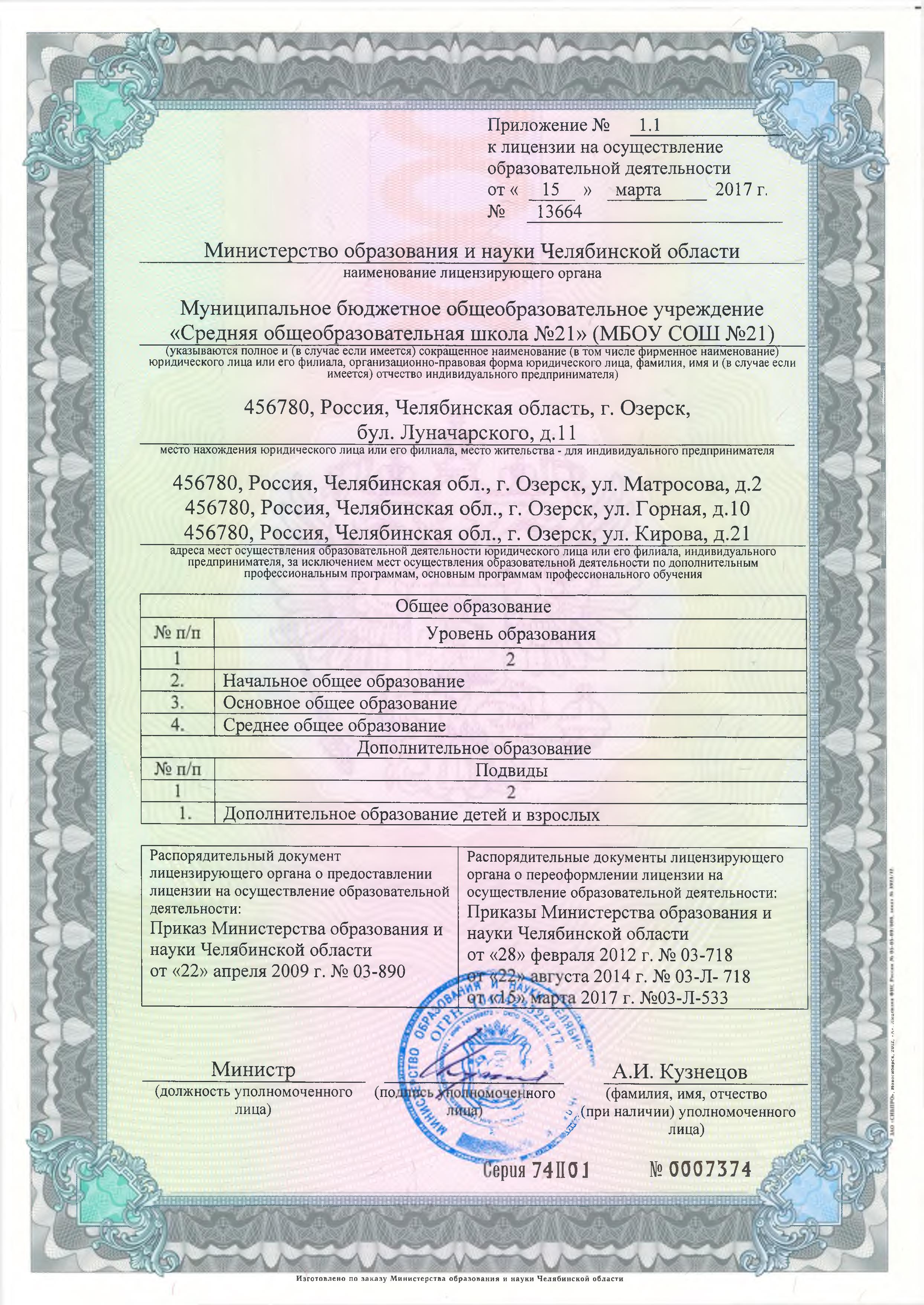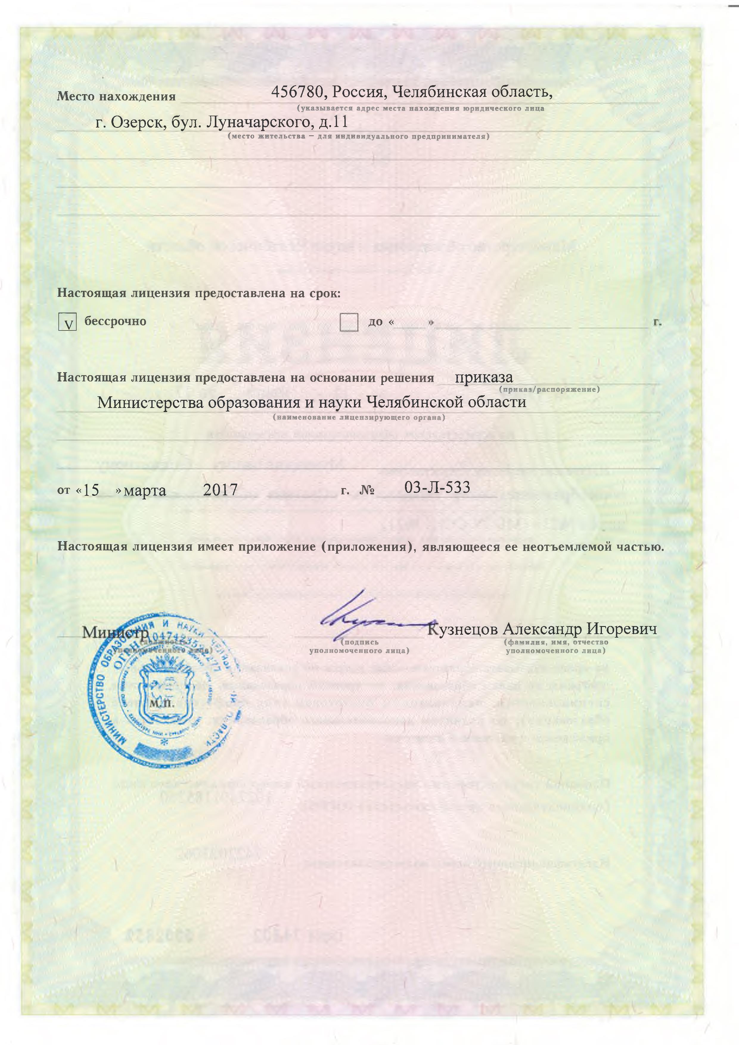 Серия: 74А01 № 0001073 Регистрационный №1937 Дата выдачи: 22.12.2014 года Срок действия: до 22.12.2026 года № приложения: 1 Орган, выдавший лицензию: Министерство образования и науки Челябинской области |